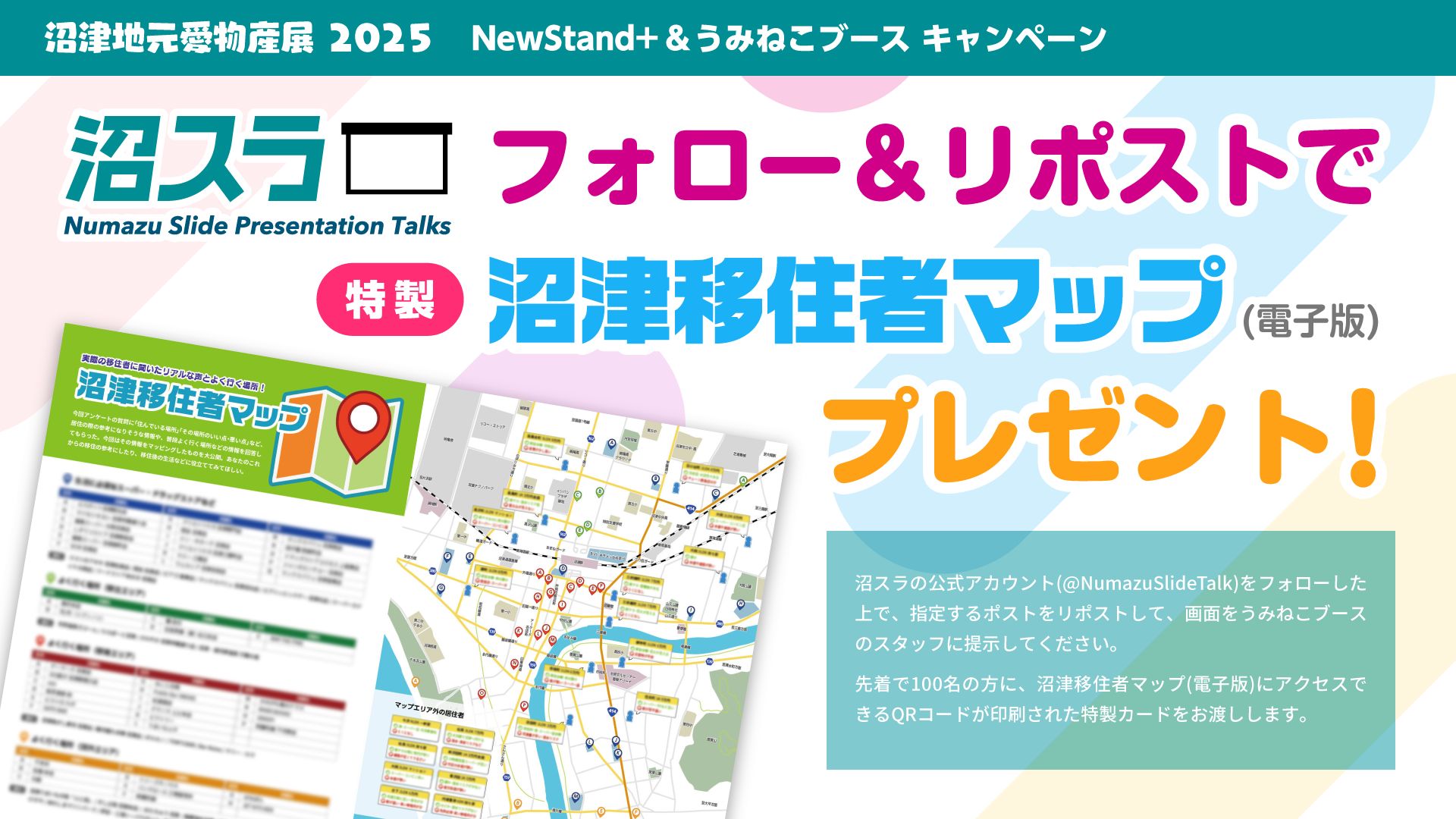 沼津スライドトークイベント の公式Xアカウント @NumazuSlideTalk をフォローした上で、以下の指定の投稿をリポストしていただいた画面をスタッフに見せて頂いた方へ、「特製・沼津移住者マップ」の電子版にアクセスできるQRコードが印刷されたカードをプレゼントします。